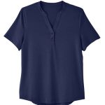 - Henley placket with metal two-snap closure